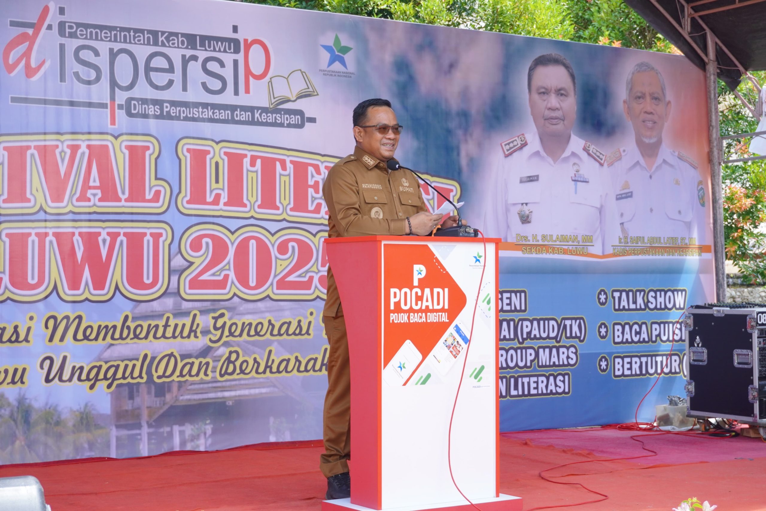 POROSCELEBES.COM.Bupati Luwu, Patahudding, membuka Festival Literasi Luwu 2025 yang mengusung tema “Literasi Membentuk Generasi Muda Luwu Unggul dan Berkarakter” di pelataran Gedung Perpustakaan Kabupaten Luwu, Senin (27/10/2025).
