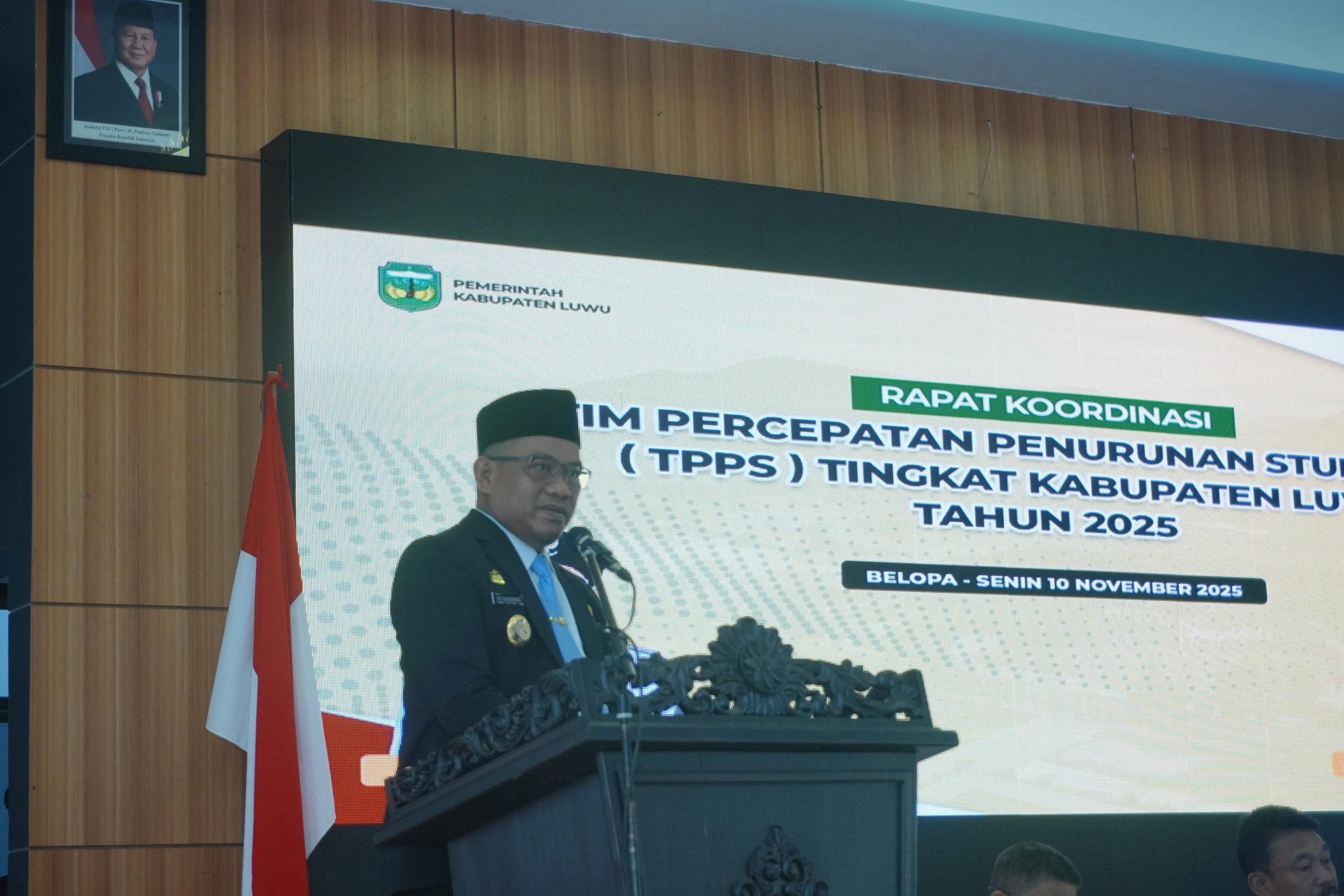 POROSCELEBES.COM-Bupati Luwu, Patahudding, membuka secara resmi Rapat Koordinasi Tim Percepatan Penurunan Stunting (TPPS) Tingkat Kabupaten Luwu Tahun 2025 yang berlangsung di Ruang Pola Kantor Bupati Luwu, Belopa, Senin (10/11/2025).