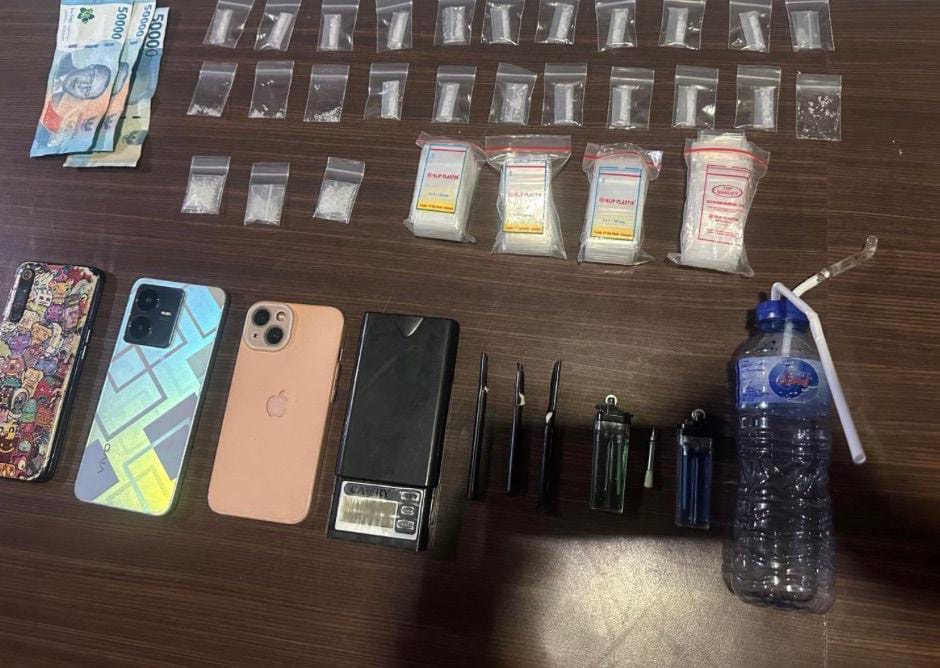 Dari hasil penggeledahan, petugas menemukan 25 sachet plastik berisi kristal bening yang diduga sabu, terdiri dari tiga sachet berukuran sedang dan 22 sachet kecil. Selain itu, turut diamankan dua unit ponsel Android, satu unit iPhone, satu timbangan digital, alat isap (bong) lengkap dengan kaca pirex, uang tunai Rp150.000 hasil penjualan sabu, serta beberapa pack plastik kosong dan pipet.