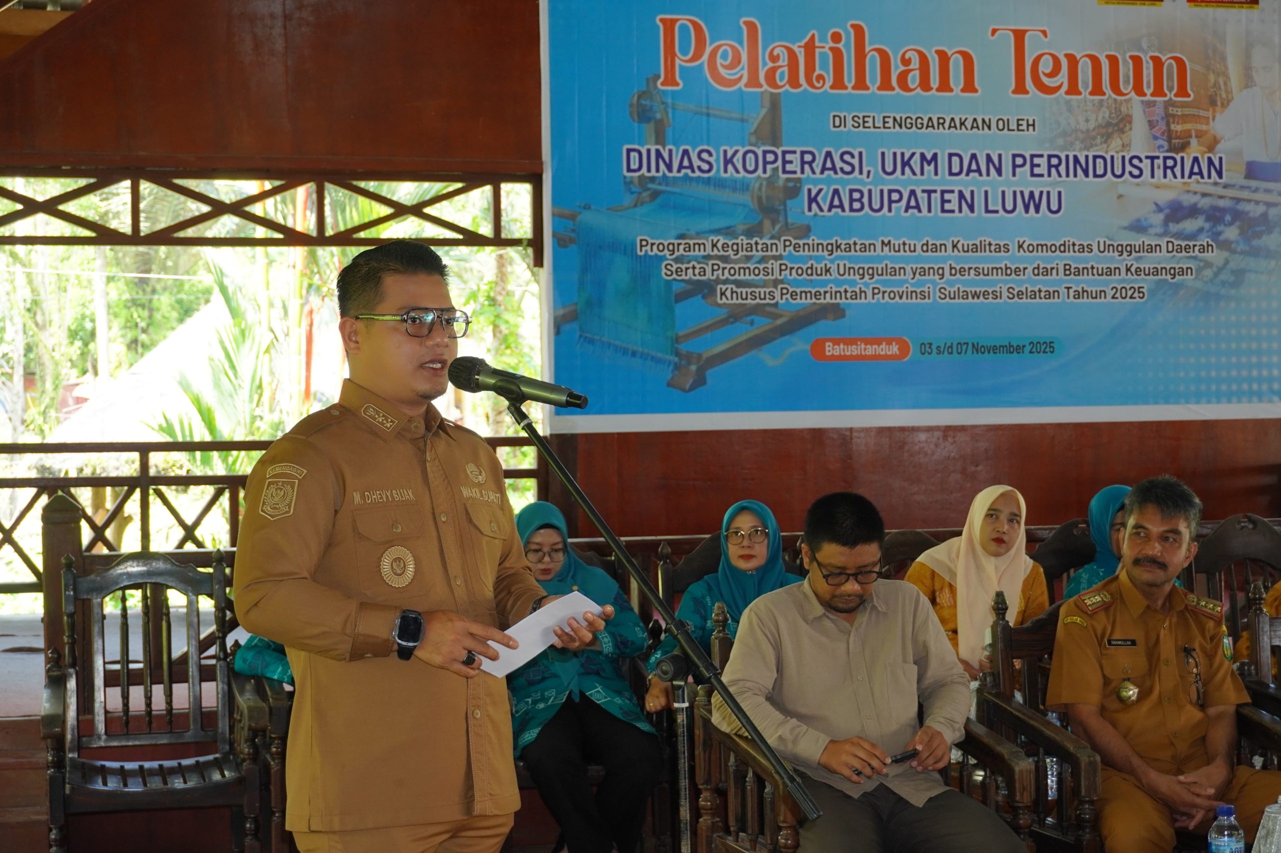 POROSCELEBES.COM – Wakil Bupati Luwu, Muh. Dhevy Bijak Pawindu, membuka kegiatan Pelatihan Tenun yang diselenggarakan oleh Dinas Koperasi, UMKM, dan Perindustrian Kabupaten Luwu di Desa Batusitanduk, Kecamatan Walenrang, Senin (3/11/2025).