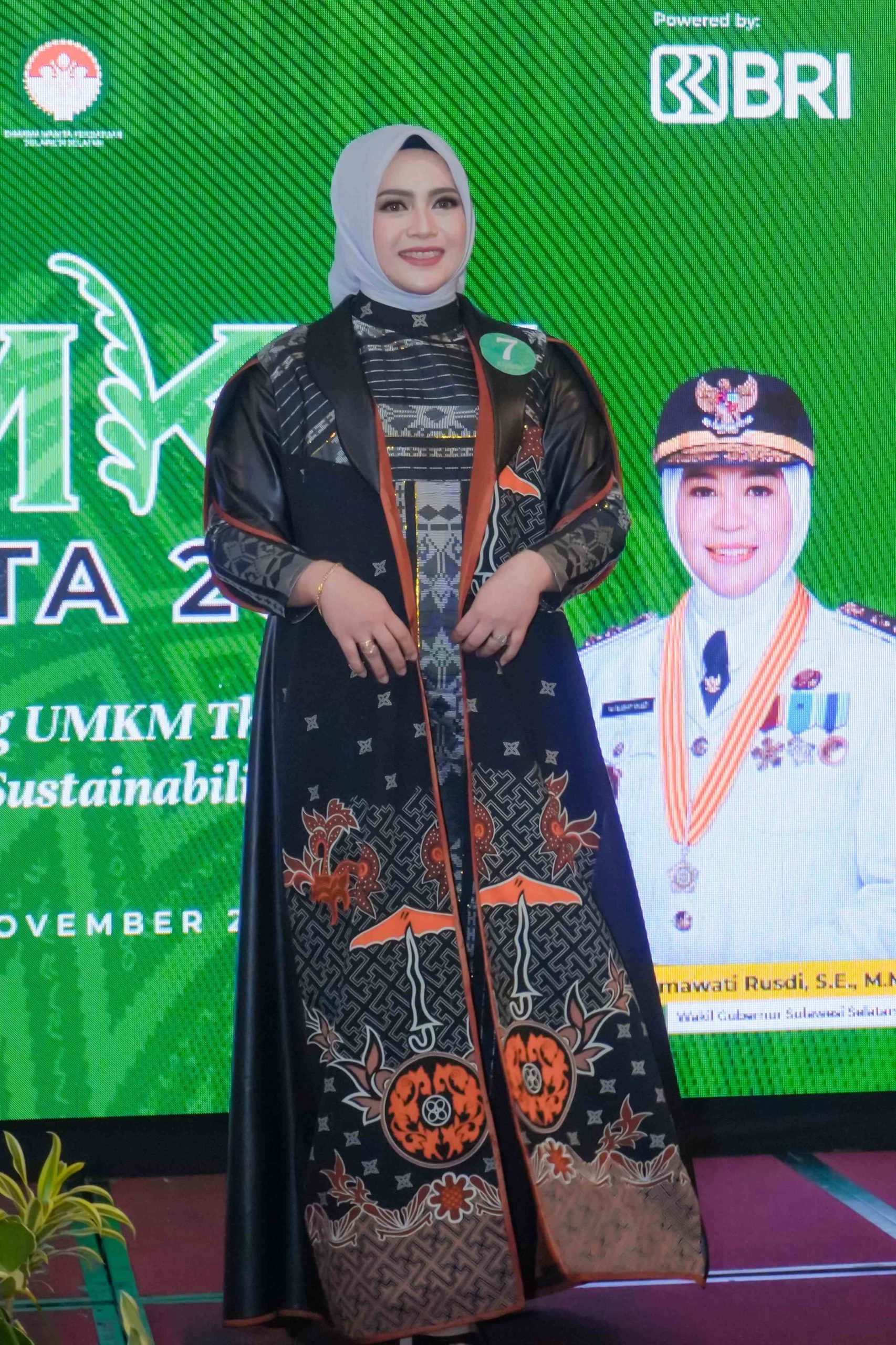 POROSCELEBES.COM – Wakil Ketua Dewan Kerajinan Nasional Daerah (Dekranasda) Kabupaten Luwu, Nilasari Dhevy Bijak, menampilkan gaun bermotif Luwu pada sesi fashion show UMKM FI3STA 2025 yang digelar di Hotel Mercure Makassar, Jumat (14/11/2025).